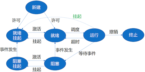 - 阻塞挂起 → 阻塞: 内存充足后,系统将高优先级阻塞挂起进程激活。