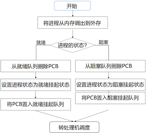 - 作用: 实现进程从就绪/阻塞状态到就绪挂起/阻塞挂起状态的转换。